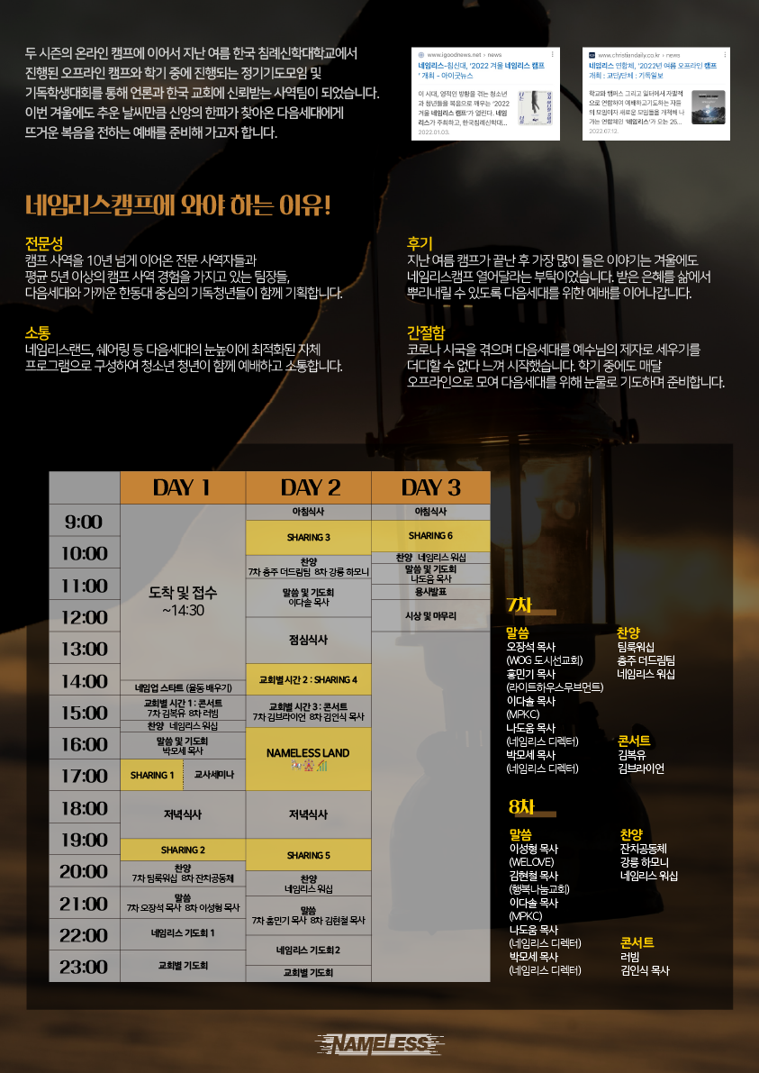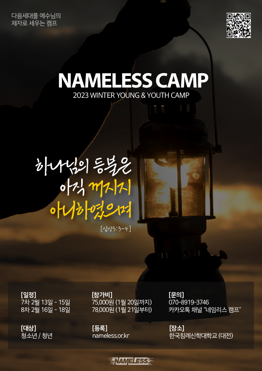 2023 겨울 네임리스 캠프(겨울수련회) 팜플렛은 아래 사이트에서 찾아보실 수 있습니다!!